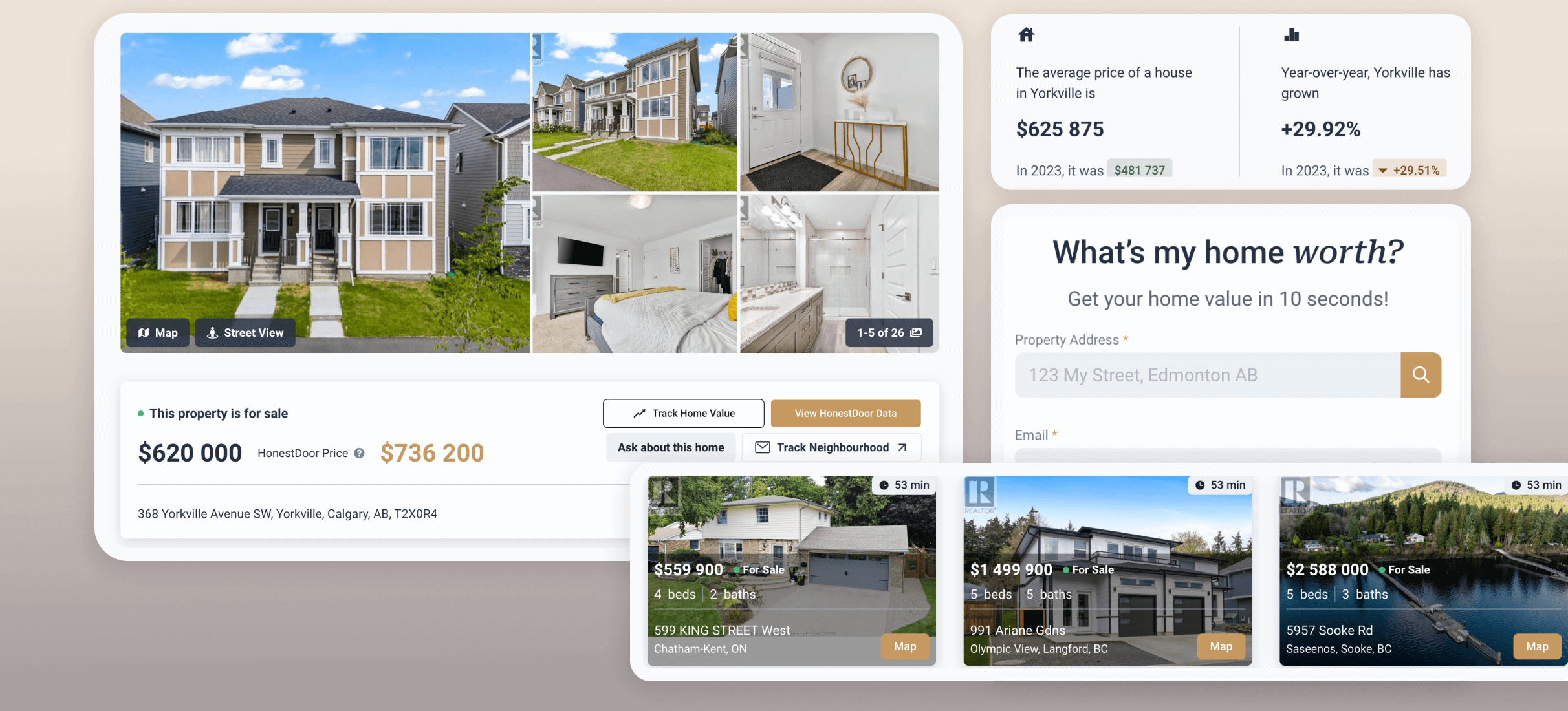 HonestDoor is an Edmonton-based company that provides free real estate data on residential and commercial properties, such as sold prices, estimated home values, and property details. HonestDoor combines real estate data with data science and machine learning to produce estimated property values for Canadian real estate buyers, sellers, investors, and lenders.